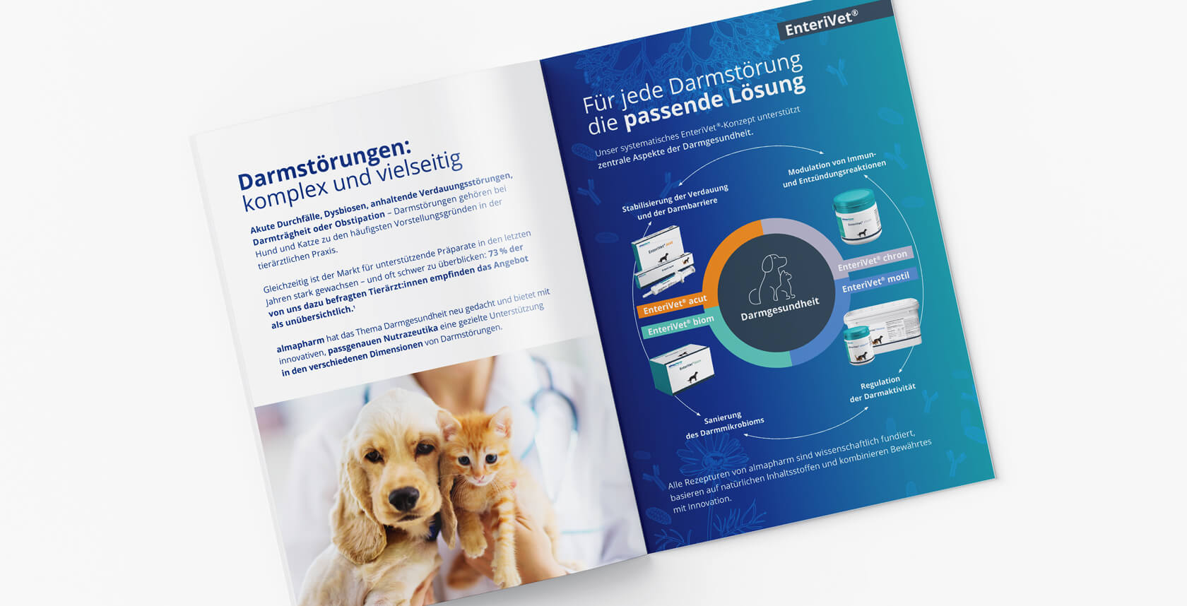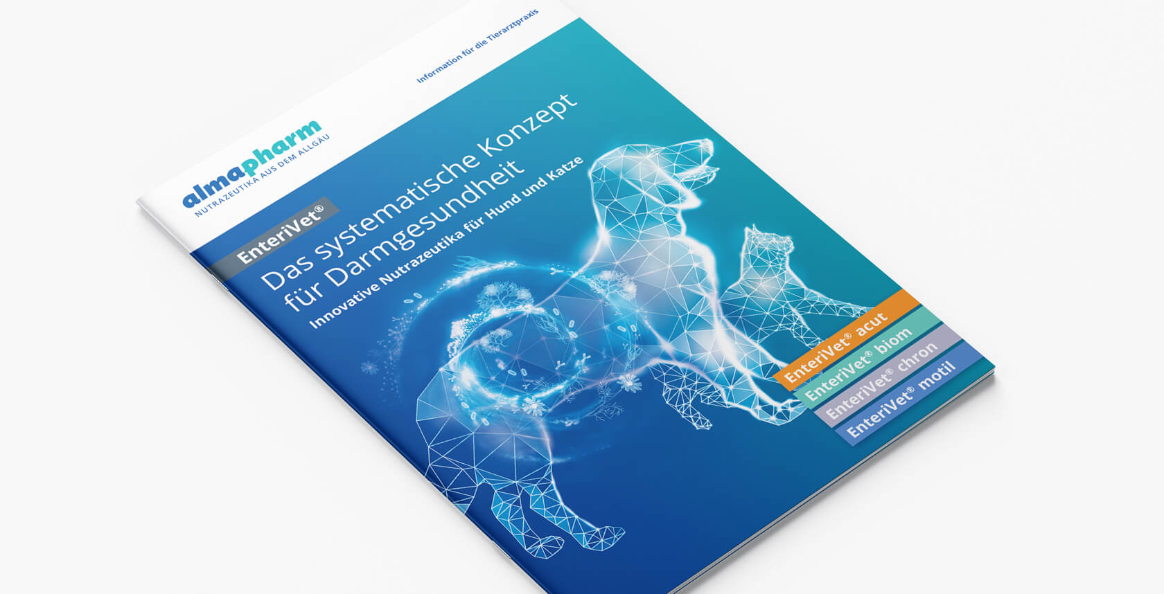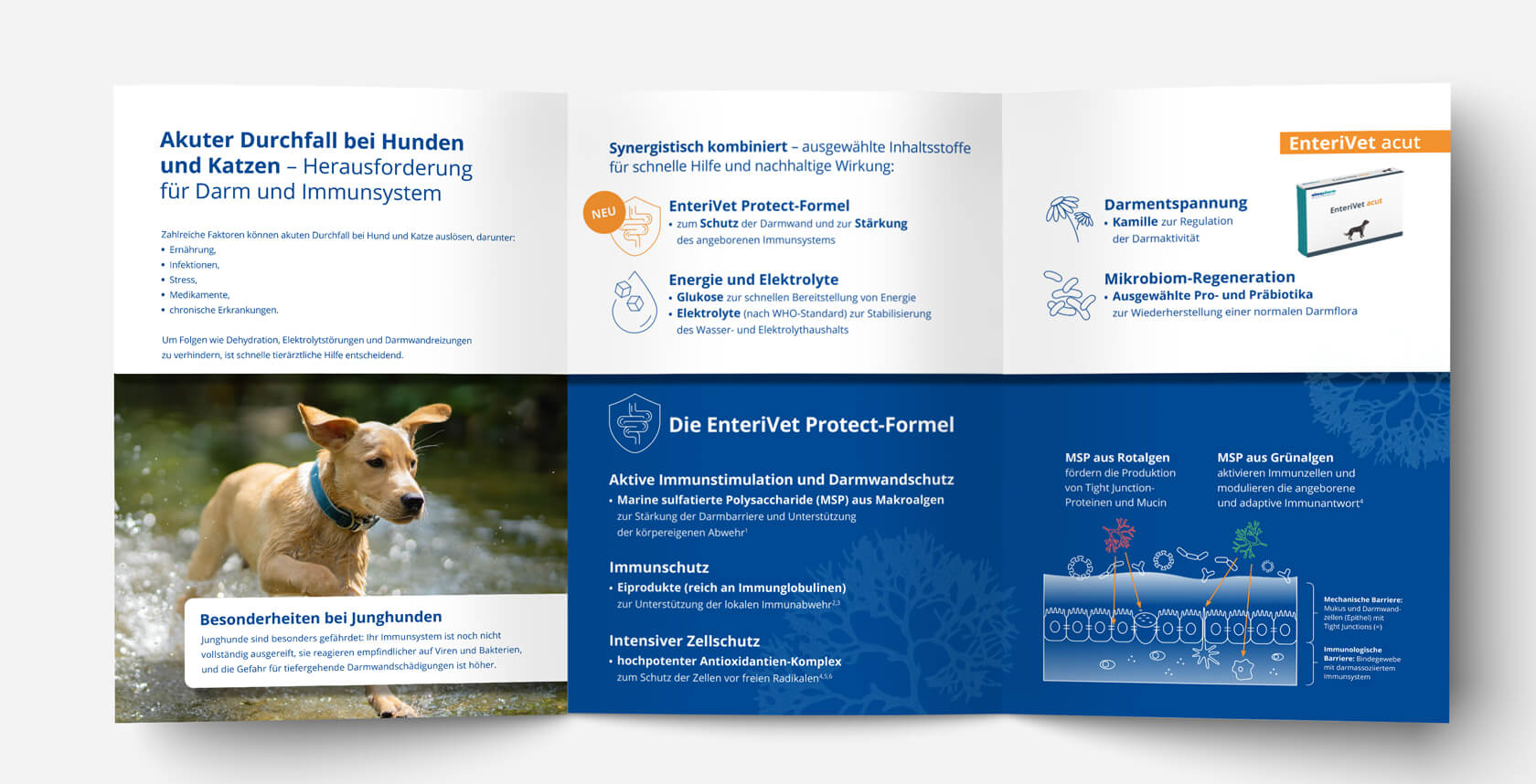 Gemeinsam mit unserem Auftraggeber haben wir das Produktsortiment zur Darmgesundheit strategisch überarbeitet und modernisiert. Im Fokus der neuen Produktmarke EnteriVet stand neben einer stringenten Marken- und Produktarchitektur die Optimierung von Naming und Claims. Ziel war es, ein charakteristisches Designkonzept zu entwickeln, das mit einer modernen, reduzierten Bildsprache arbeitet. Diese visualisiert symbolisch das Zielorgan sowie die zentralen Inhaltsstoffe („Hero-Ingredients“) der Nutrazeutika – prägnant und auf den Punkt gebracht. Klare Produkt-Claims unterstützen die Positionierung zusätzlich und sorgen für eine schnelle inhaltliche Orientierung.