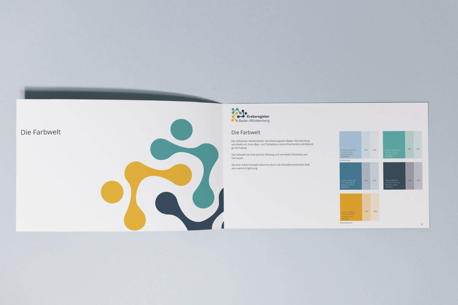 Auch die gezielte Anwendung von Farbkombinationen kann erheblichen Einfluss auf die Wahrnehmung ausüben und positive Assoziationen bei der Zielgruppe wecken. Ein überzeugendes Beispiel hierfür ist das Corporate Design, das Remy&Remy für das Krebsregister Baden-Württemberg (KRBW) entwickelt hat: Im Fokus stehen kühle Farbtöne wie Blau und Türkis, die Stabilität, Sicherheit, Transparenz und Fortschritt vermitteln. Diese werden ergänzt durch die Komplementärfarbe Gelb, die nicht nur Wärme und Freundlichkeit in die Palette bringt, sondern auch eine Verbindung zu Baden-Württemberg herstellt indem es das starke Gold in dessen Landesfarben aufnimmt. Insgesamt verstärkt die ausgewogene Kombination dieser Farben das professionelle Erscheinungsbild des KRBWs und fördert zugleich eine positive emotionale Resonanz bei der Zielgruppe.