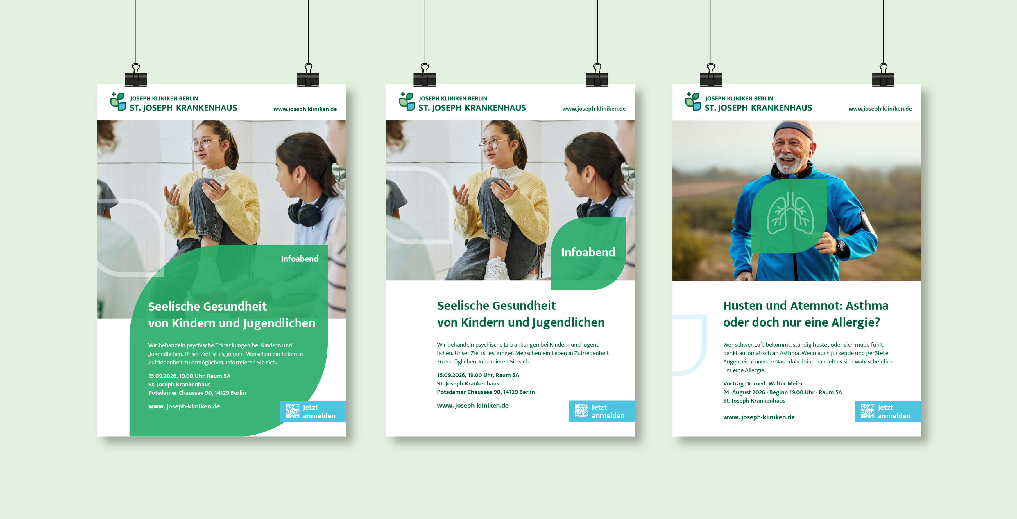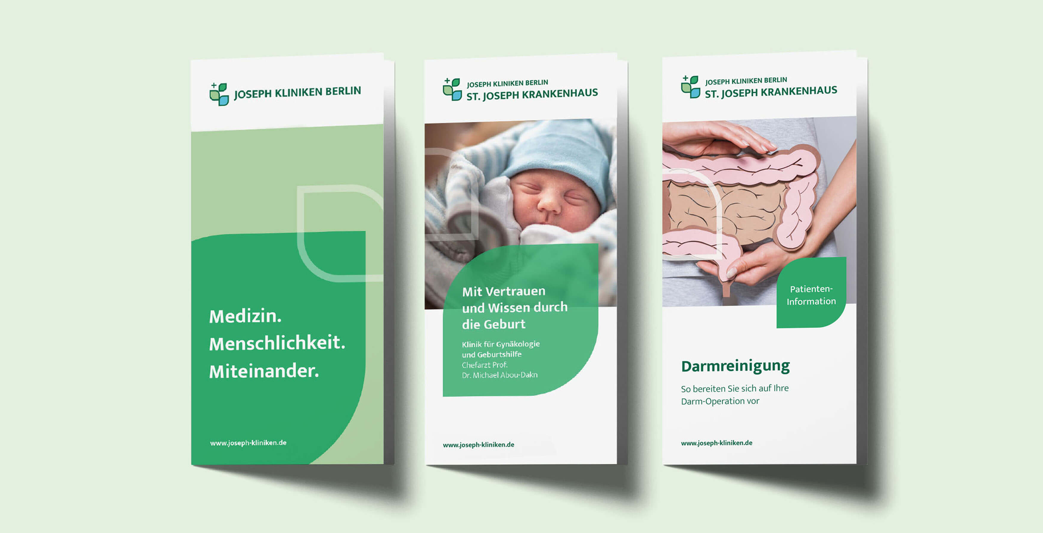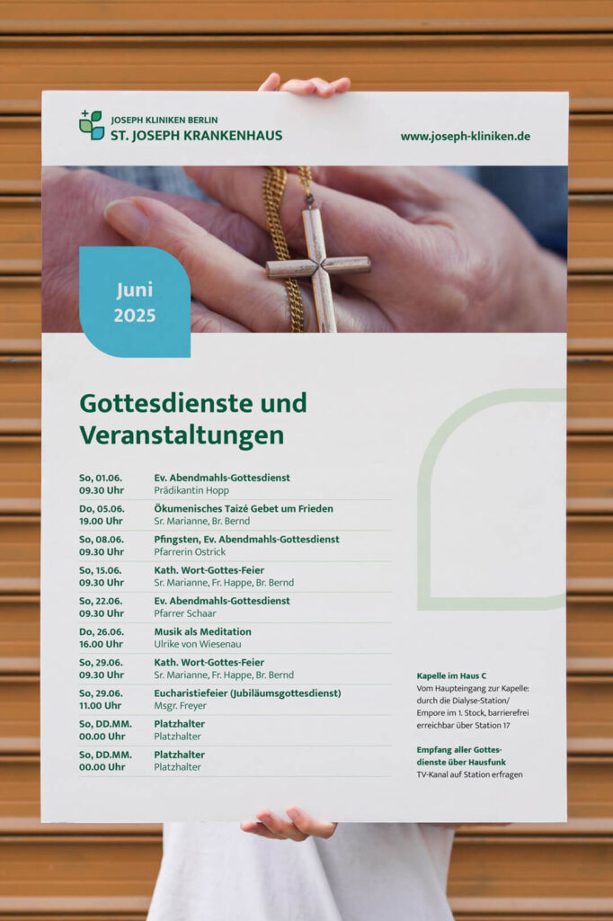 Das St. Joseph Krankenhaus in Berlin-Tempelhof und das Franziskus-Krankenhaus in Berlin-Tiergarten sind traditionsreiche katholische Häuser der Hauptstadt. Nach der Übernahme des Franziskus-Krankenhauses entstand ein Krankenhaus mit zwei Standorten, die bisher jeweils ein eigenes Corporate Design hatten. Mit der neuen Dachmarke „Joseph Kliniken Berlin“ sollte ein übergeordnetes Erscheinungsbild entstehen, das die gemeinsame Wertebasis sichtbar macht, ohne die Eigenständigkeit der einzelnen Häuser zu verlieren.