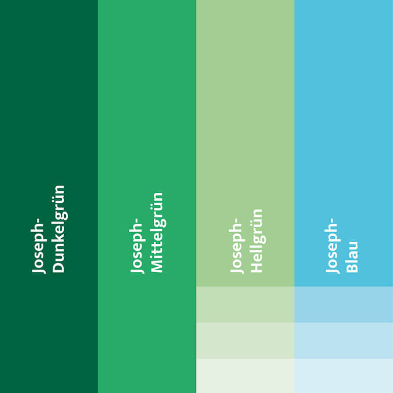 Im Zentrum des neuen Auftritts steht das Symbol des hl. Joseph: Ein Stab, aus dem – wie durch ein Wunder – Blätter und Blüten treiben. In moderner grafischer Form interpretiert, verkörpern die kraftvollen Blätter die Handlungsstärke, die aus dem Zusammenschluss der Häuser erwächst. Über dem Stab fügt sich wie eine Blüte ein Balkenkreuz ein – das bekannte Symbol für Medizin und Fürsorge. Die Blätter finden sich auch als sekundäres Gestaltungselementen wieder – mal als Fläche, mal als Kontur – und verleihen dem Erscheinungsbild Lebendigkeit und Wiedererkennbarkeit.
