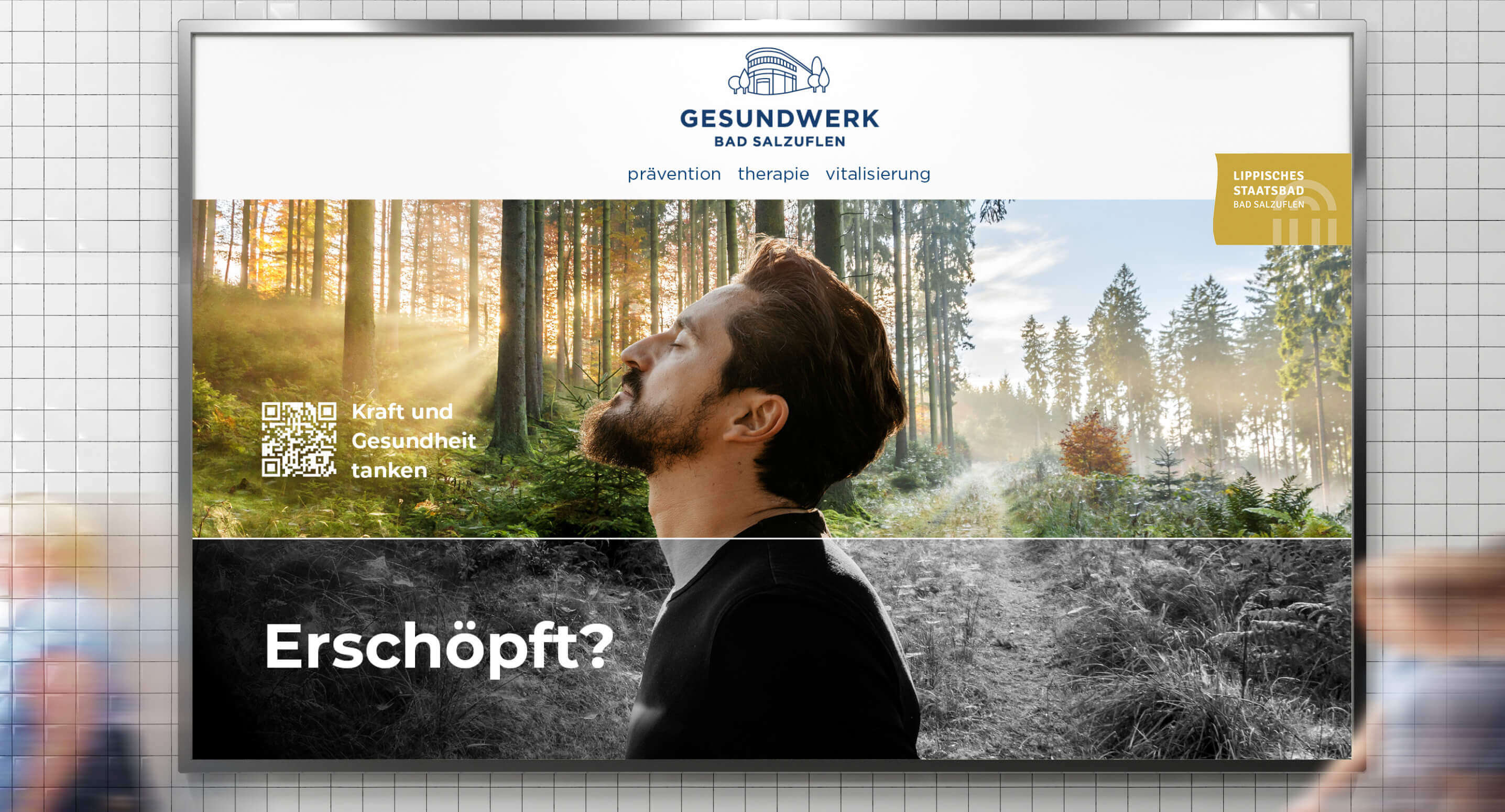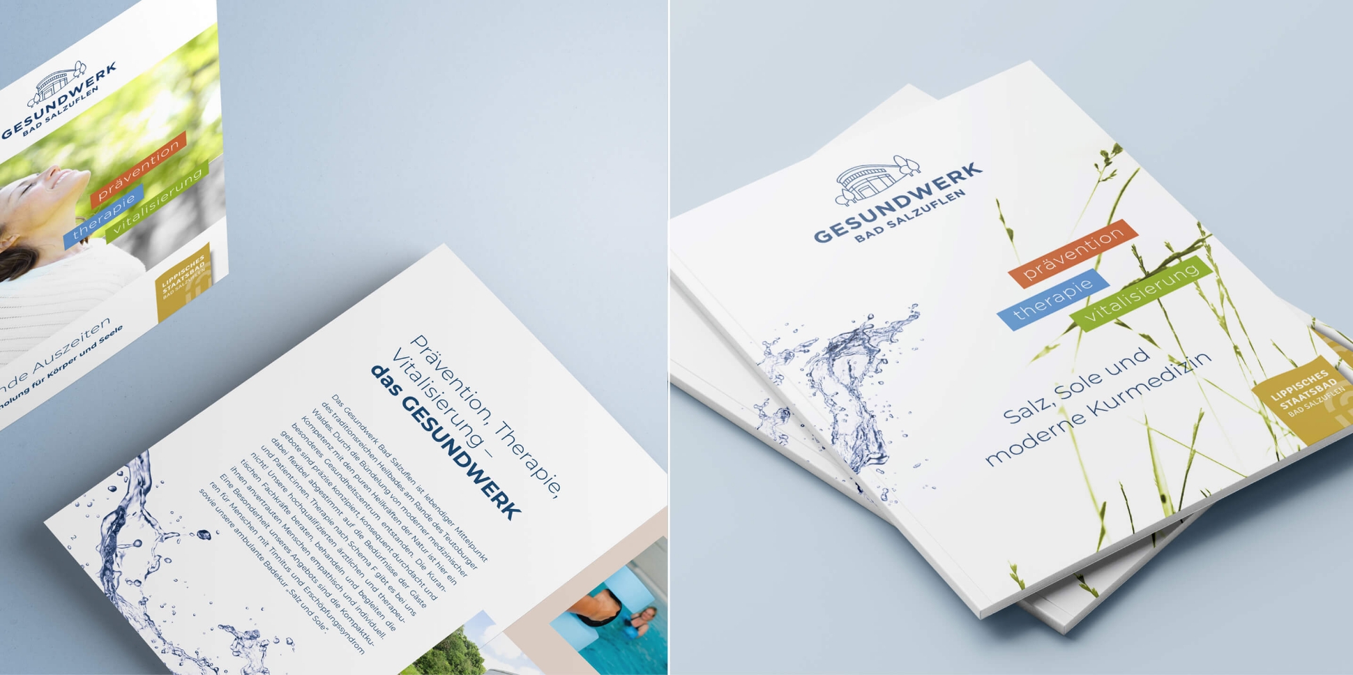 Ein Beispiel dafür ist unsere Zusammenarbeit mit dem Gesundwerk Bad Salzuflen, früher bekannt als „Staatsbad Vitalzentrum GmbH“. Das Zentrum bietet ein umfangreiches Angebot an Gesundheitsleistungen, ambulanten Badekuren, Kompaktkuren und Präventionsmaßnahmen, stand in den vergangenen Jahrzehnten jedoch ohne große eigene Strahlkraft im Schatten der städtischen Identität. Im Zuge einer strukturellen Neuorganisation des traditionsreichen Staatsbads Bad Salzuflen war daher erklärtes Ziel, auch dem Gesundwerk eine eigenständige, unverwechselbare Präsenz zu verleihen, die sowohl seine langjährige Tradition als auch die Modernität seiner Angebote widerspiegelt.